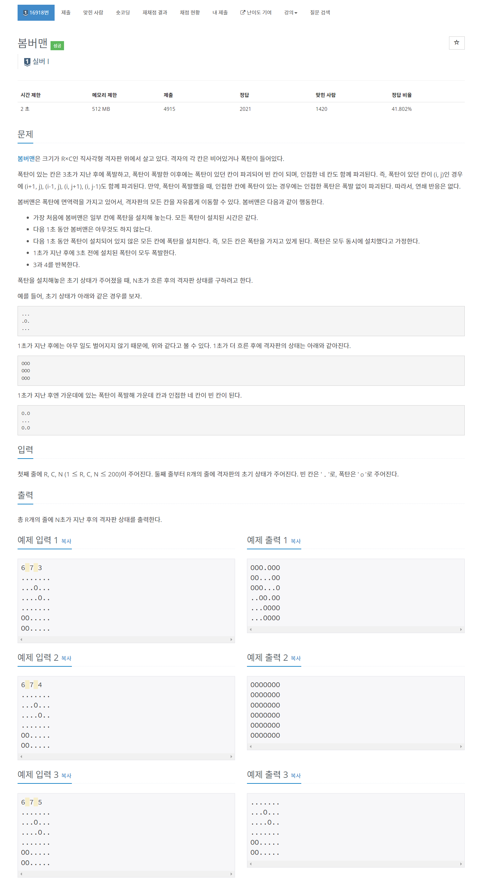 // BOJ / 16918번 / 봄버맨 / 구현, 시뮬레이션 , 그래프 / 실버1
