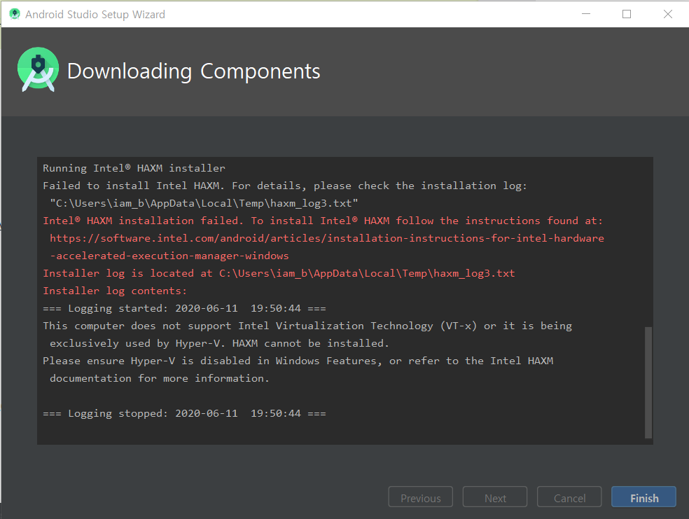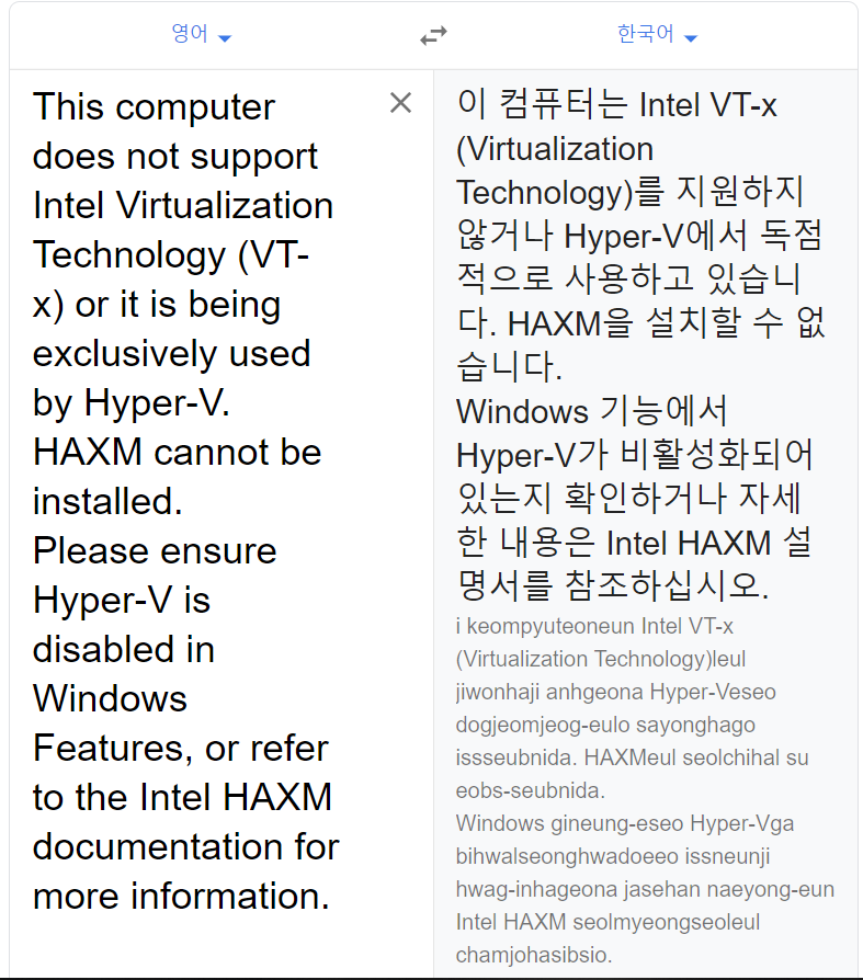 이 컴퓨터는 Intel VT-x(Virtualization Technology)를 지원하지 않거나 Hyper-V에서 독점적으로 사용하고 있습니다. HAXM을 설치할 수 없습니다. Windows 기능에서 Hyper-V가 비활성화되어 있는지 확인하거나 자세한 내용은 Intel HAXM 설명서를 참조하십시오.