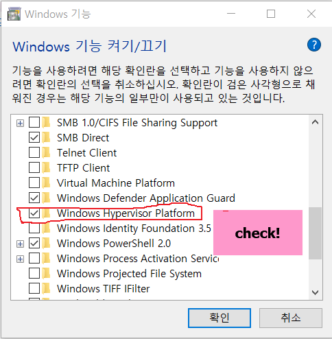 4. 마찬가지로, "Windows Hypervisor Platform" 항목 체크 활성화한다.