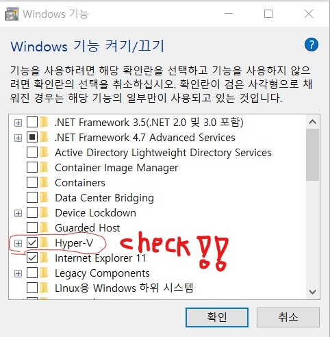 3. 항목 리스트 중, "Hyper-V" 항목 체크 활성화한다.