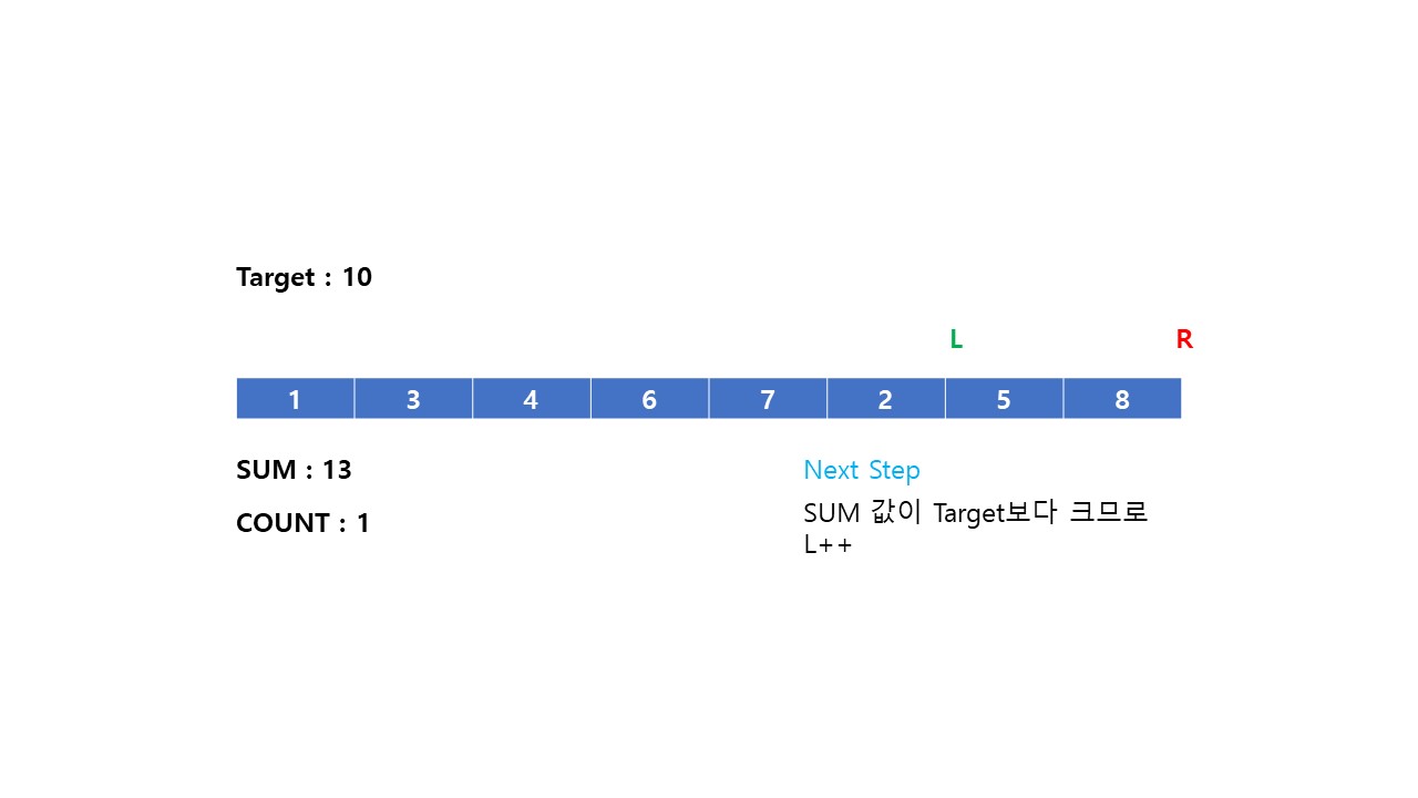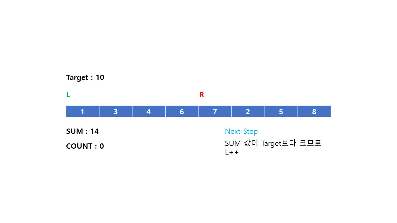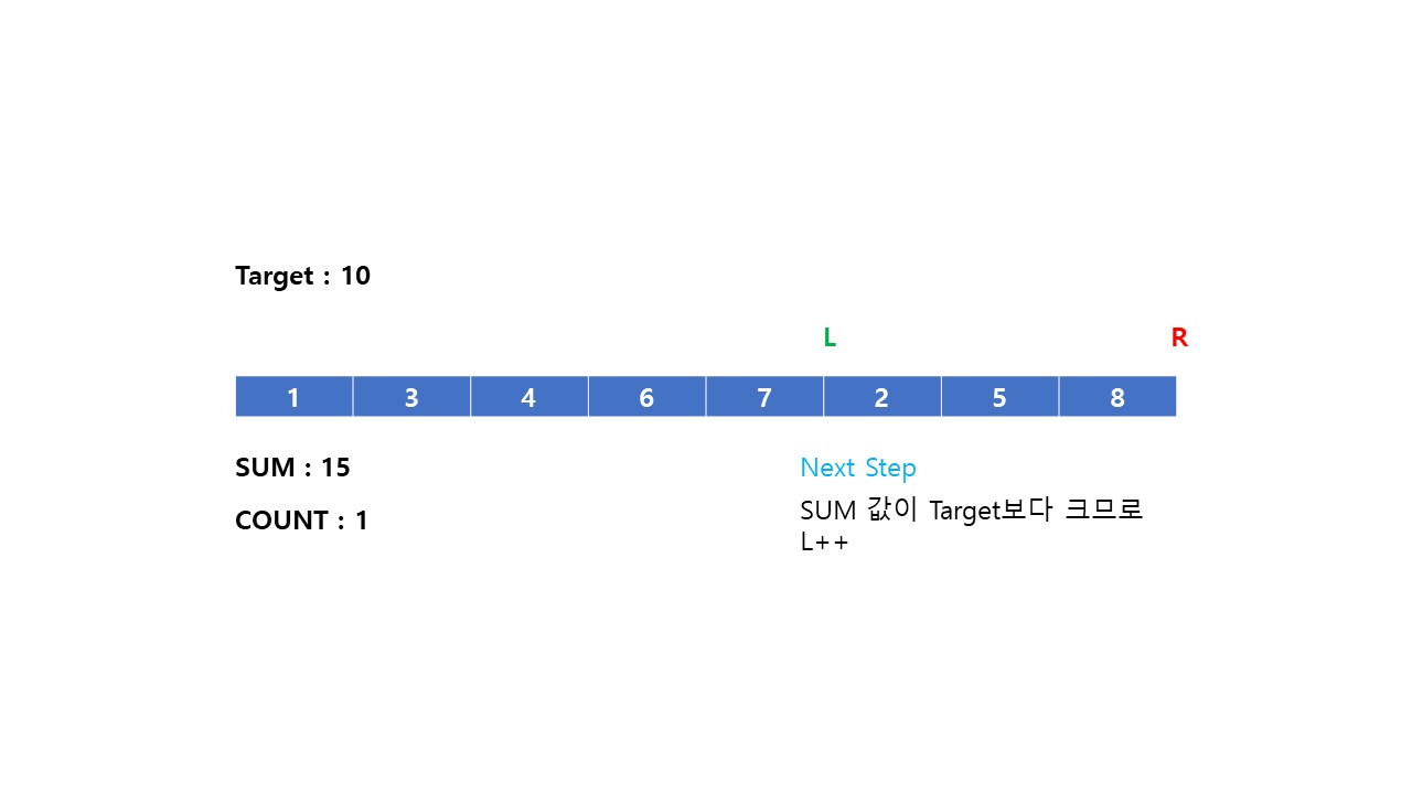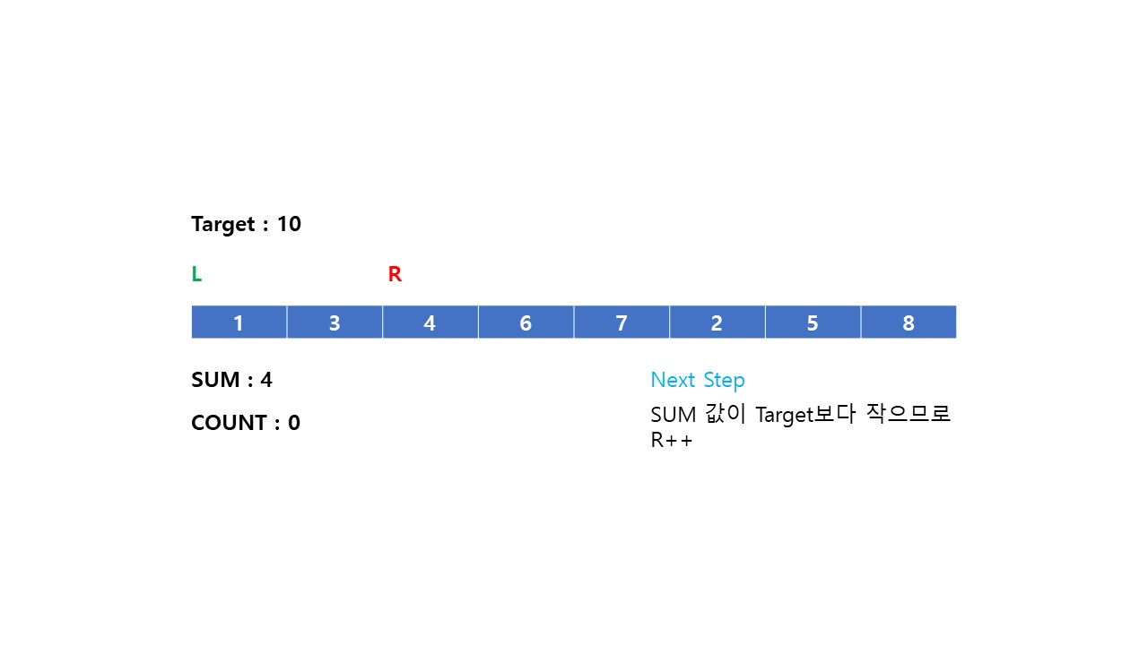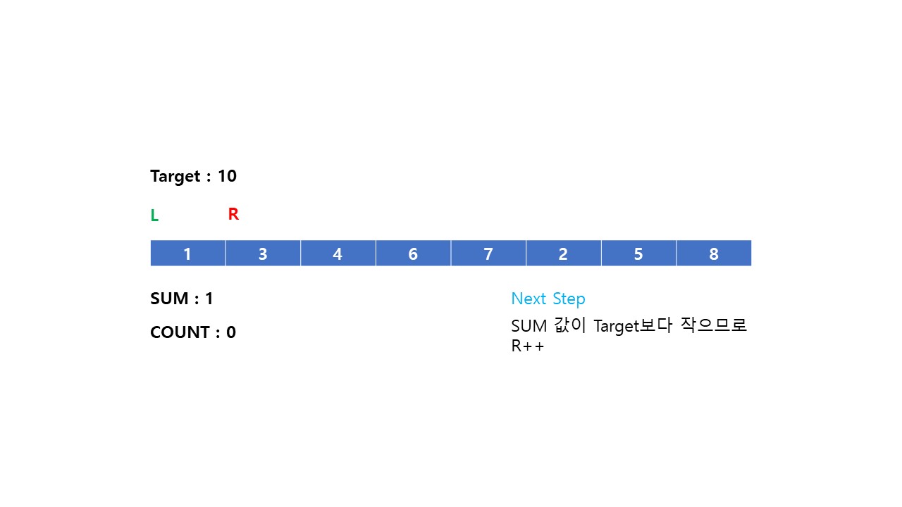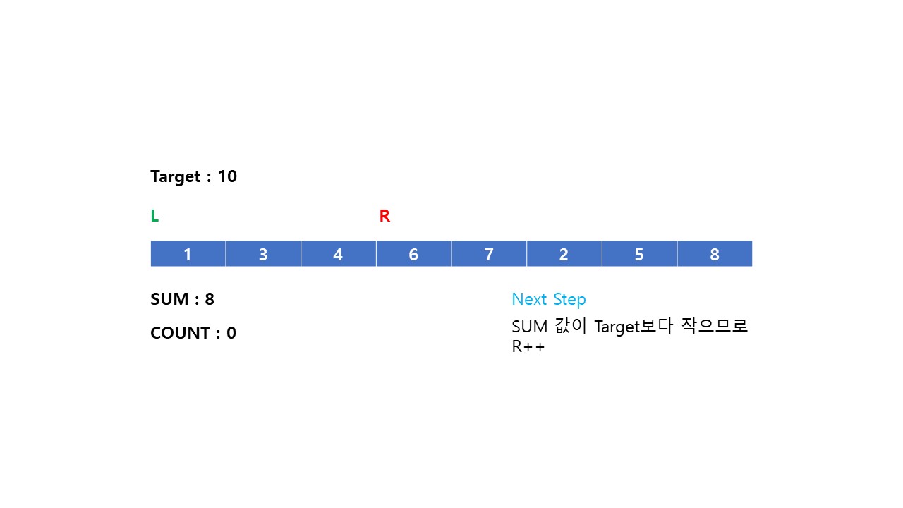 (2) 부분 배열의 합이 Target 값보다 작으면 Right = Right + 1 해줍니다. (부분 배열의 길이를 늘려 합을 더한다.)