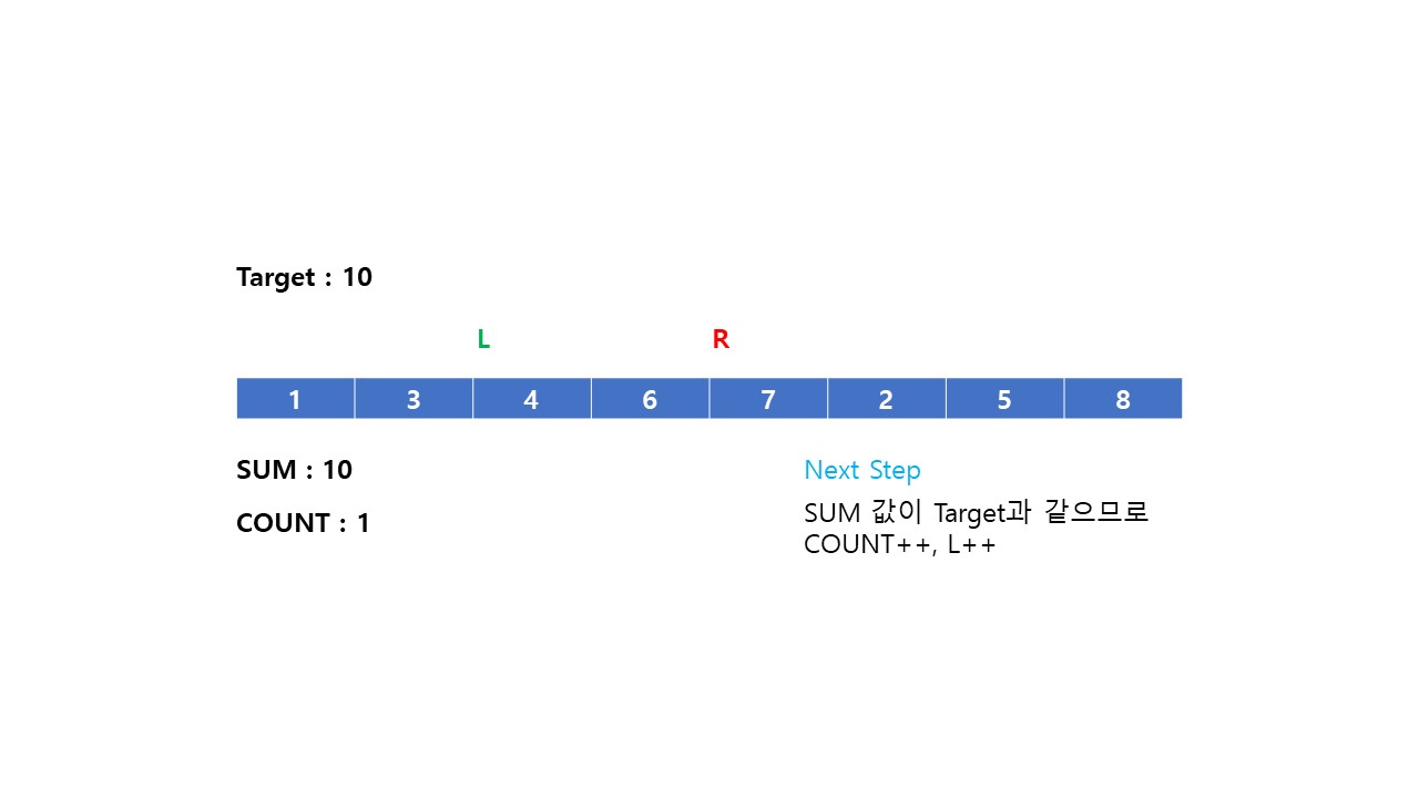 (3) 부분 배열의 합이 Target 값과 같다면 결과 값을 +1 해줍니다.