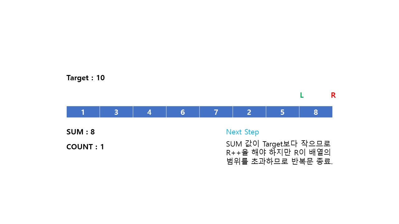 반복문을 종료하는 시점은 R이 배열의 길이를 초과하는 경우입니다. 하지만 상황에 따라 다릅니다. 만약 R이 증가하여 배열의 마지막(arr.length)에 위치하였을 때 부분 배열의 길이가 Target보다 작다면 L의 위치 여부와 관계없이 그대로 종료해도 됩니다.