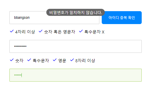 가입하기 버튼 하나를 클릭하면 직전 입력 폼들을 전부 검사하여, 미흡 또는 완벽 입력인지 판단 후 사용자의 가입을 결정합니다.