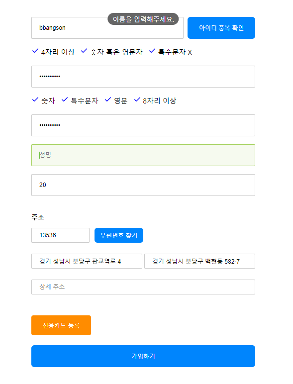 간단하게 설명하자면, 주소는 다음 API를 활용하여 팝업 창을 띄워 등록하고, 신용 카드는 모달을 띄워 입력과 유효성 검사를 진행하도록 구현하였습니다.