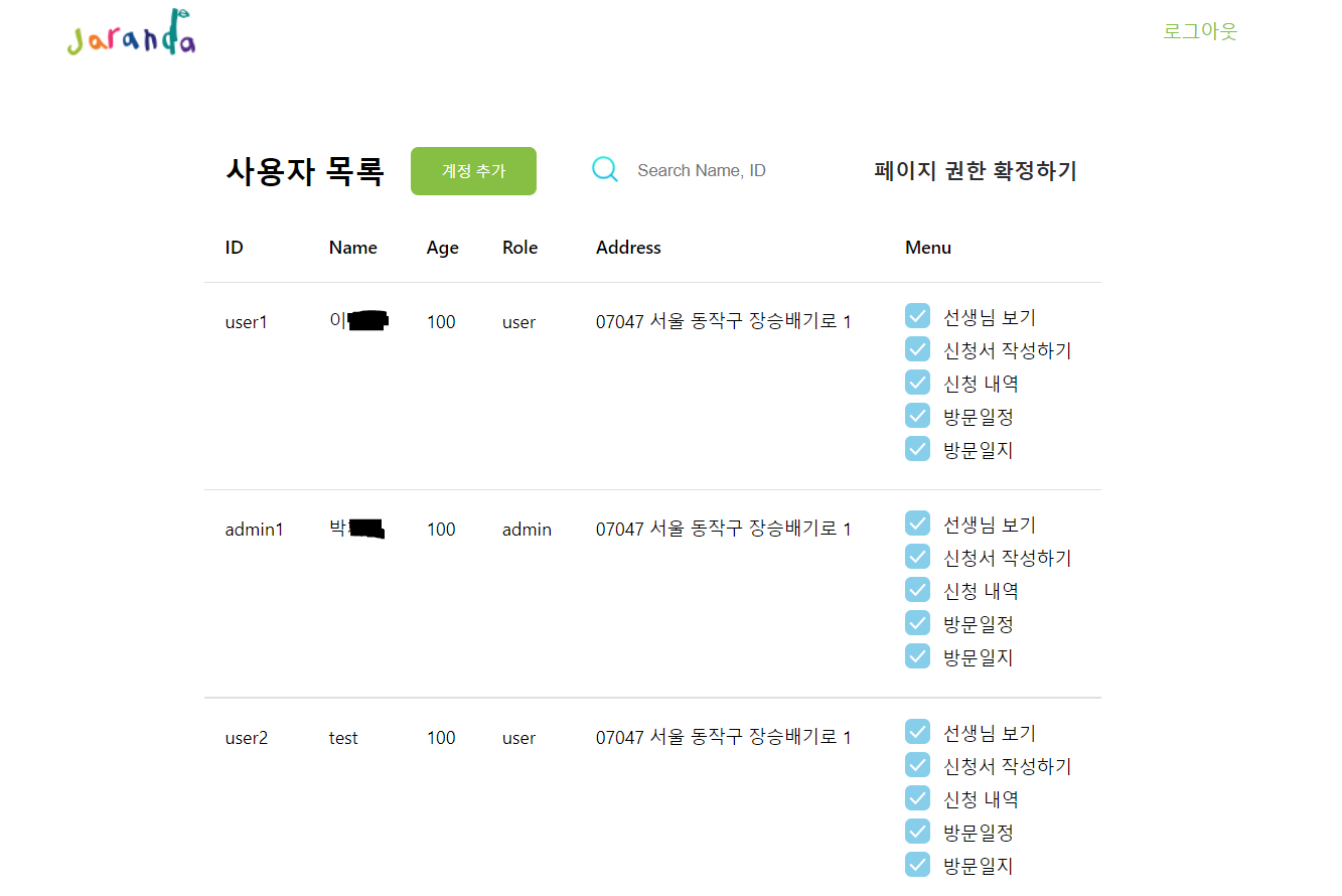 관리자 페이지는 다음과 같이 구현되어있습니다. (이름은 개인 정보상 가렸습니다.)
