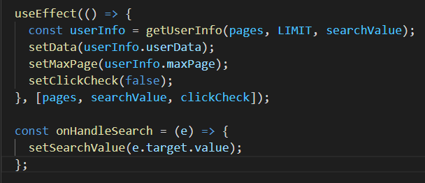 참고로 getUserInfo 함수의 인자인 pages는 현재 페이지를 의미하며, LIMIT은 데이터를 한 페이지에 렌터링하는 최대 개수인 10을 저장한 상수, searchValue는 검색 값입니다.